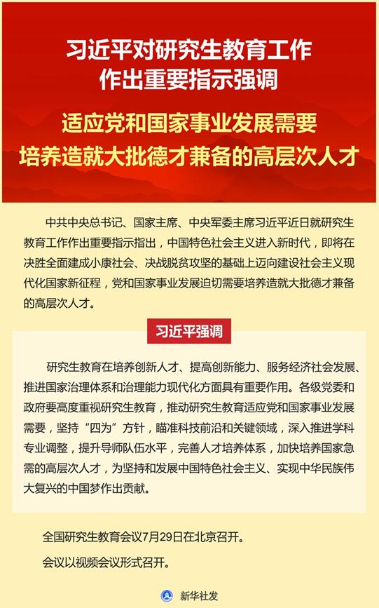 新华社北京7月29日电(记者胡浩)中共中央总书记、国家主席、中央军委主席习近平近日就研究生教育工作作出重要指示指出,中国特色社会主义进入新时代,即将在决胜全面建成小康社会、决战脱贫攻坚的基础上迈向建设社会主义现代化国家新征程,党和国家事业发展迫切需要培养造就大批德才兼备的高层次人才。