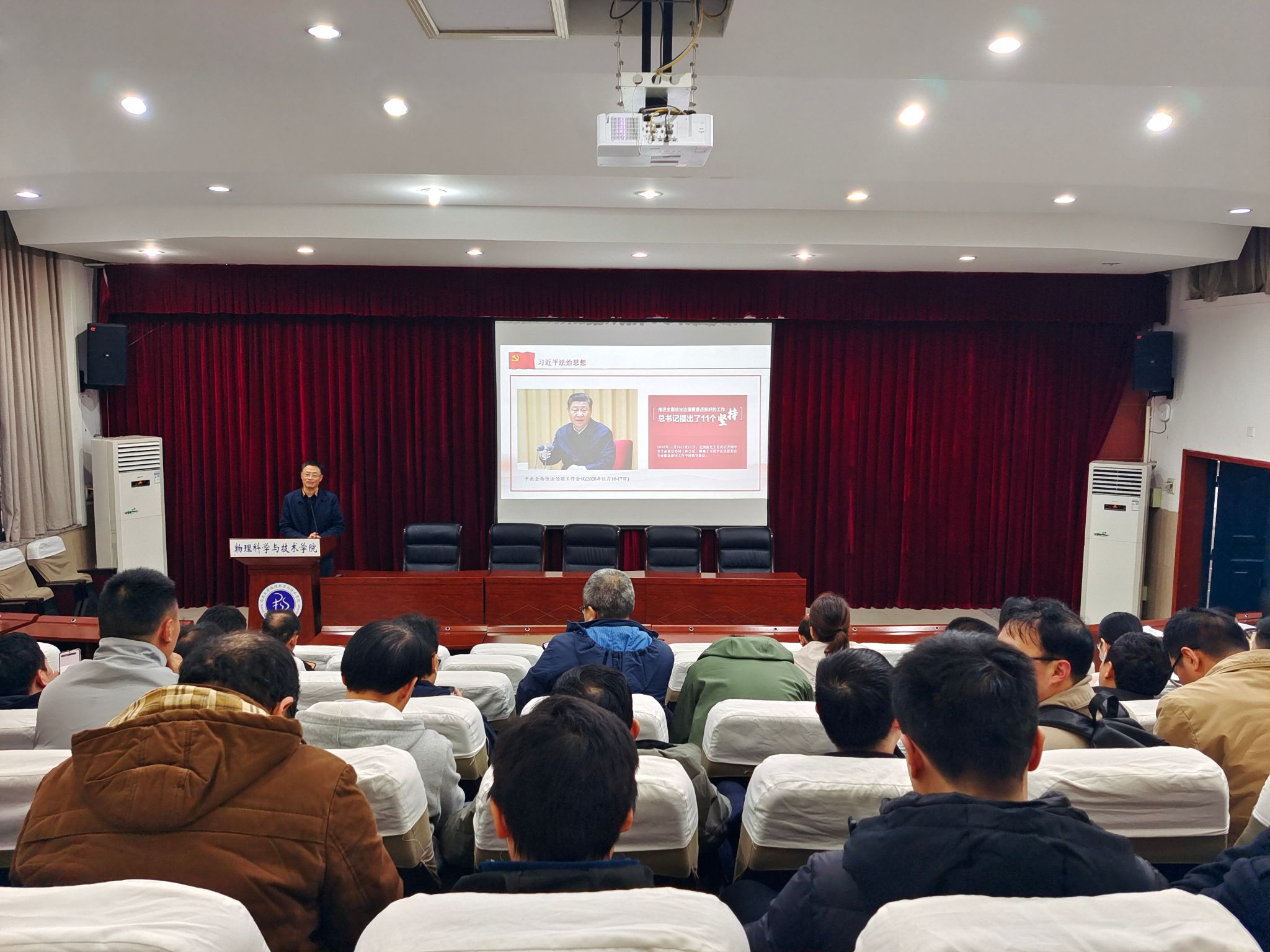 李余廷书记首先带领大家学习了习近平法治思想。他指出,习近平法治思想主要方面集中体现为“十一个坚持”,其核心要义深刻阐明了全面依法治国的政治方向、重要地位、重点任务、重大关系、工作布局、重要保障,构成了一个富有开创性、实践性、真理性、前瞻性的科学思想体系。他强调,习近平法治思想是新时代十年法治建设最重要的标志性成果,是我们党百年来提出的最全面、最系统、最科学的法治思想体系,是全面依法治国的根本遵循和行动指南,为发展马克思主义法治理论作出重大原创性贡献,实现了马克思主义法治理论中国化时代化新的飞跃,标志着我们党对社会主义法治建设和人类法治文明发展的规律性认识达到新的历史高度,成为引领新时代中国特色社会主义法治建设的思想旗帜。接着,李余廷书记带领大家逐一认真学习了《中华人民共和国宪法》《中华人民共和国高等教育法》《中华人民共和国教师法》《中华人民共和国反间谍法》等内容。同时,李余廷书记也向全体教职工详细介绍了学校哲社及自然科学活动的申报流程。