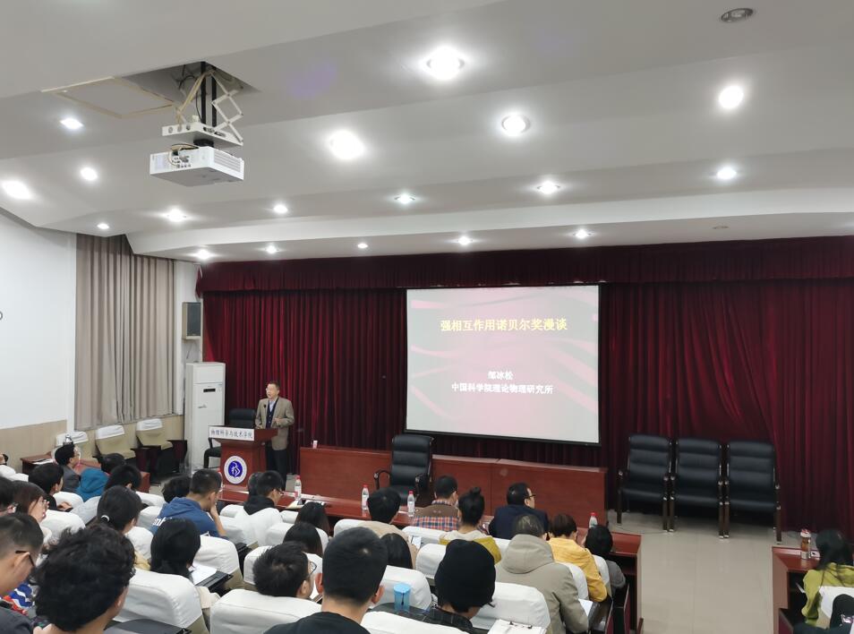 中科院理论物理所副所长、中科院高能所理论物理室主任、中国科学院大科学装置理论物理研究中心主任邹冰松教授应校科协和我院邀请,于10月27日上午在学院小阶梯教室作了题为“强相互作用诺贝尔奖漫谈”的365英国上市集团。