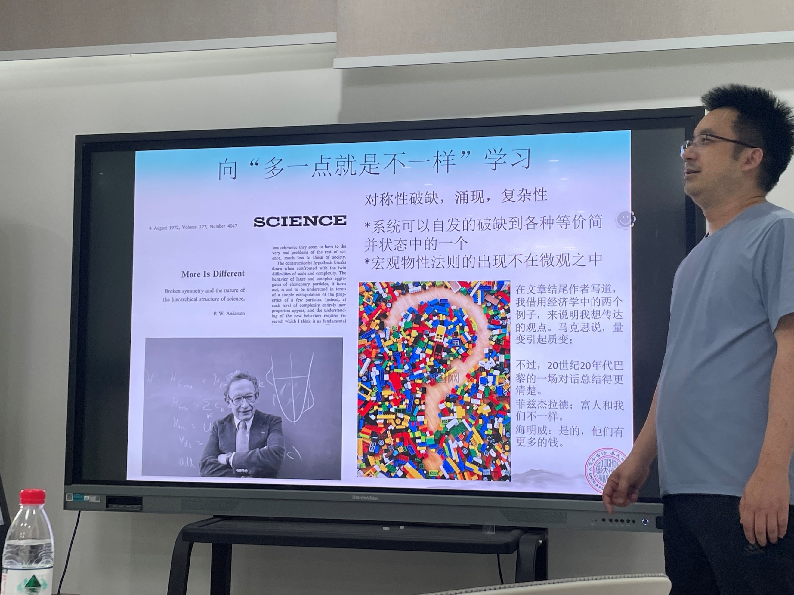 在大尺度下,施教授通过丰富的图片和视频,直观地展现了鸟群、羊群和菌群的大尺度流体力学特性,深入浅出地介绍了活性物质在多体相互作用下所展现出的基本特点和物理洞察。针对上述图像,施教授介绍了简单的Vicsek模型,并展示了其在百万量级下的计算所展现出的丰富群体行为。之后,施教授介绍了他最近在活性布朗粒子、杆状粒子中的最新的研究成果,并用以解释活性液体的中失稳的气泡和各种拓扑缺陷的产生与湮灭。最后,施教授从物理哲学的高度,介绍了著名物理学家P. W. Anderson“多者异也的重要思想,阐述了软凝聚态物理中对称性破缺、涌现和复杂性的特点,最后以海明威和菲兹杰拉德的对话结束讲座,施教授的报告从不同层面上展现了物理学之美,激发起广大师生热烈的讨论和共鸣。