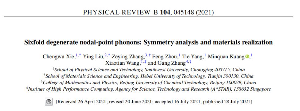 近期,学院王啸天副教授等人在拓扑声子材料研究方面取得一系列进展,在Physical Review B、Physical Review Materials上连续发表系列研究论文。Physical Review B由美国物理学会(APS)出版,是凝聚态理论方面极具影响力和权威性的期刊,是自然指数(Nature Index)收录的全球82个顶级期刊之一。