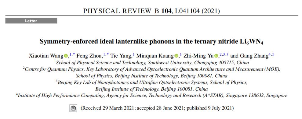 (1)Phys. Rev. B, (Letter形式)104,L041104 (2021)论文的第一作者为我院王啸天博士,通讯作者为北京理工大学余智明教授及新加坡科技局张刚教授。文章提出了新型的对称性诱导的灯笼型的拓扑声子态,并对其深层物理机制展开研究。