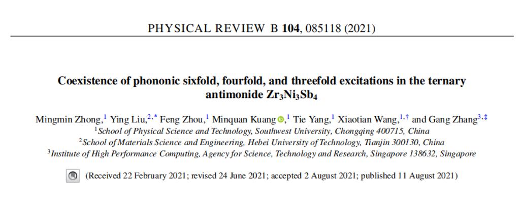 (3)在电子材料中开发六重激发态是近期拓扑领域最前沿的方向之一。王啸天博士研究团队首次提出声子中也有可能出现的六重激发态,并通过对称性分析总结出所有可能的情况,成果发表于Phys. Rev. B, 104, 045148 (2021)。论文的第一作者为我院研究生谢承武,通讯作者为我院王啸天博士,北京化工大学张泽英博士,和新加坡科技局张刚教授。