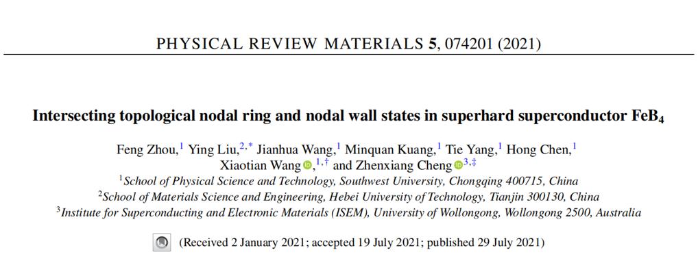 (4)Phys. Rev. Mater. 5, 074201 (2021)论文的第一作者为我院研究生周凤,通讯作者为我院王啸天博士、河北工业大学刘影博士、澳大利亚伍伦贡大学程振祥教授。我们提出FeB4材料具有拓扑节线、拓扑节面、超导和超硬的多重物性,并对其深层物理机制展开研究。