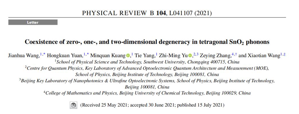 (2)Phys. Rev. B, 104,L041107 (2021)论文的第一作者为我院研究生王建华,通讯作者为我院王啸天博士和北京化工大学张泽英博士。我们首次在声子中提出同时兼具0, 1, 2维拓扑元素的已经合成的材料SnO2,以“Letter”的形式发表于Phys. Rev. B, 104, L041107 (2021)。
