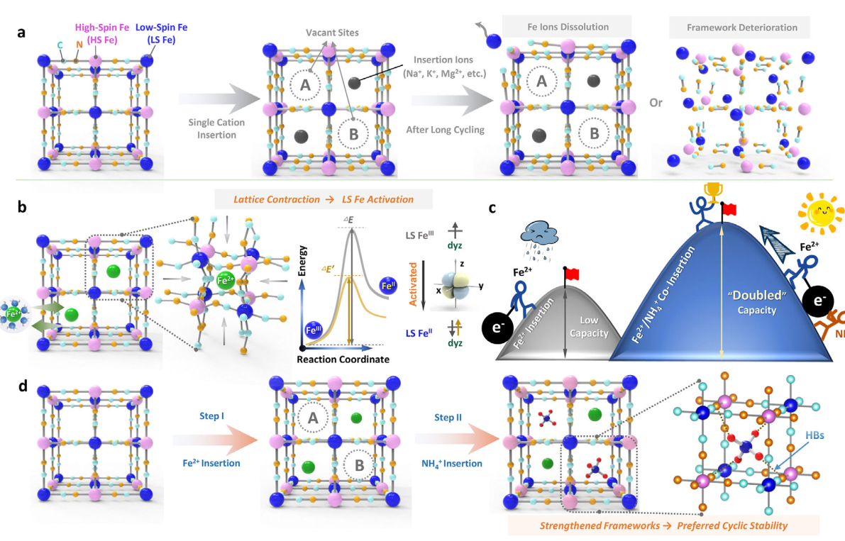 众多电池体系中,以Fe2+为载流子的水系铁离子电池受到越来越多的研究与关注,其核心竞争优势在于:(1)铁元素地壳丰度高,原料成本低廉;(2)铁基电极可实现多电子转移反应,金属铁负极具备超高的理论比容量(960 mAh/g,7557 mAh/cm3);(3)基于廉价无机铁盐配置的水系电解液兼具离子电导率高、绿色环保等应用优势。值得强调的是,铁基正极对水系铁离子电池的性能具有决定性影响。然而,针对铁离子电池正极的研究仍较为匮乏,已开发的正极体系包括转换型(S8I2等)和脱嵌型(LiFeO4、普鲁士蓝类似物等)。其中,铁基普鲁士蓝(FeHCF)凭借其开放的框架结构、高度可逆的氧化还原反应以及多功能离子存储特性,被视为最具应用潜力的正极。但遗憾的是,该正极在实际应用中面临严峻挑战:(1)低自旋FeIII位点失活,导致其实际容量远低于理论值;(2)离子反复脱嵌易引发正极结构畸变和FeIII解离,致使电池循环稳定性差。