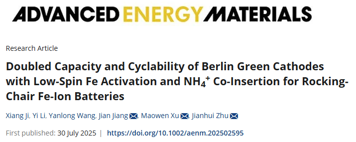 近日,学院朱建慧副教授团队在物理应用类国际TOP期刊《Advanced Energy Materials》(中科院一区TOP,IF:26)上发表题为“Doubled Capacity and Cyclability of Berlin Green Cathodes with Low-Spin Fe Activation and NH4+ Co-Insertion for Rocking-Chair Fe-Ion Batteries”的研究论文。我院2023级硕士研究生吉祥为论文第一作者,朱建慧副教授为通讯作者,365英国上市集团物理科学与技术学院为第一完成单位。该工作得到了国家自然科学基金、重庆自然科学基金和重庆市创新创业项目的资助。