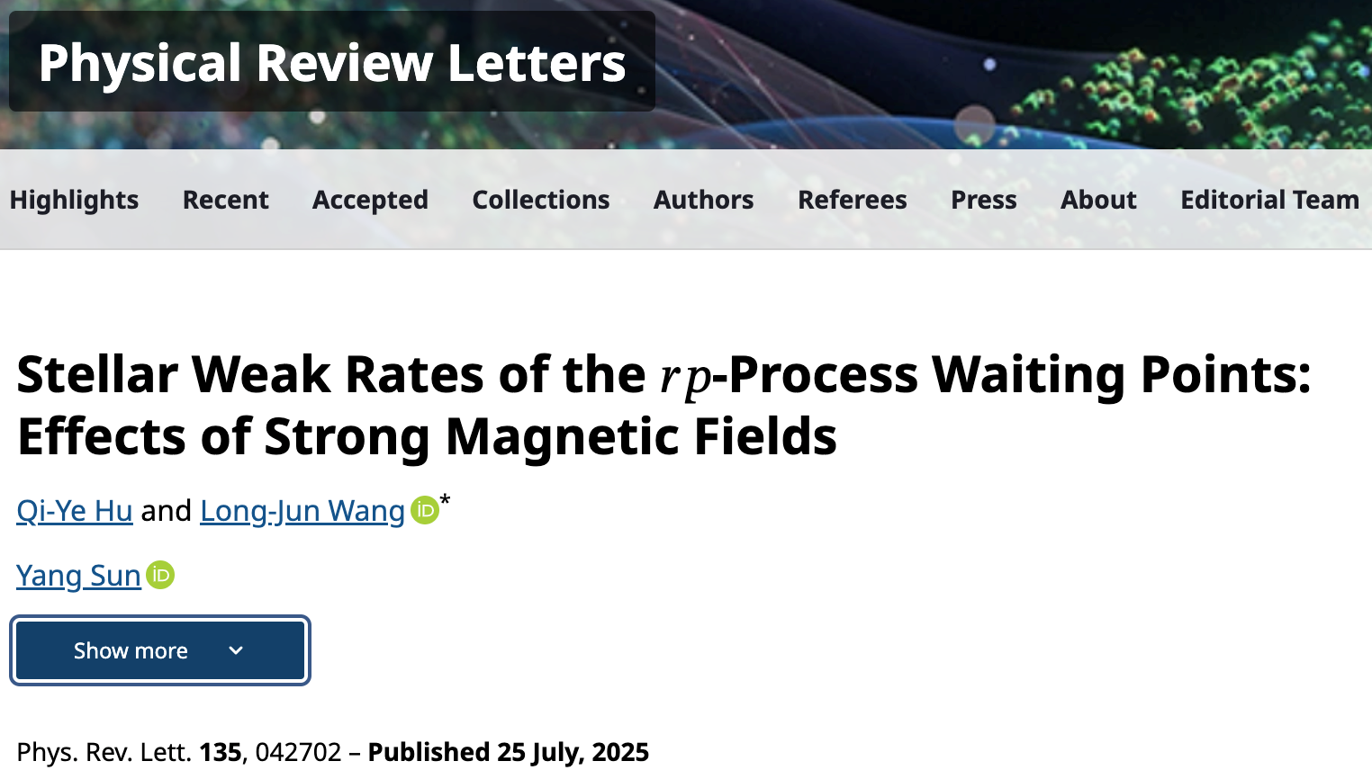 近日,学校物理科学与技术学院王龙军教授与上海交通大学孙扬教授合作在物理学顶级期刊Physical Review Letters(简称PRL)上发表题为“Stellar Weak Rates of the rp-Process Waiting Points: Effects of Strong Magnetic Fields”的科研工作。2023级硕士研究生胡其业为第一作者,王龙军教授为通讯作者,365英国上市集团物理科学与技术学院为第一完成单位。该工作得到了国家自然科学基金(12275225, 12235003)的资助。
