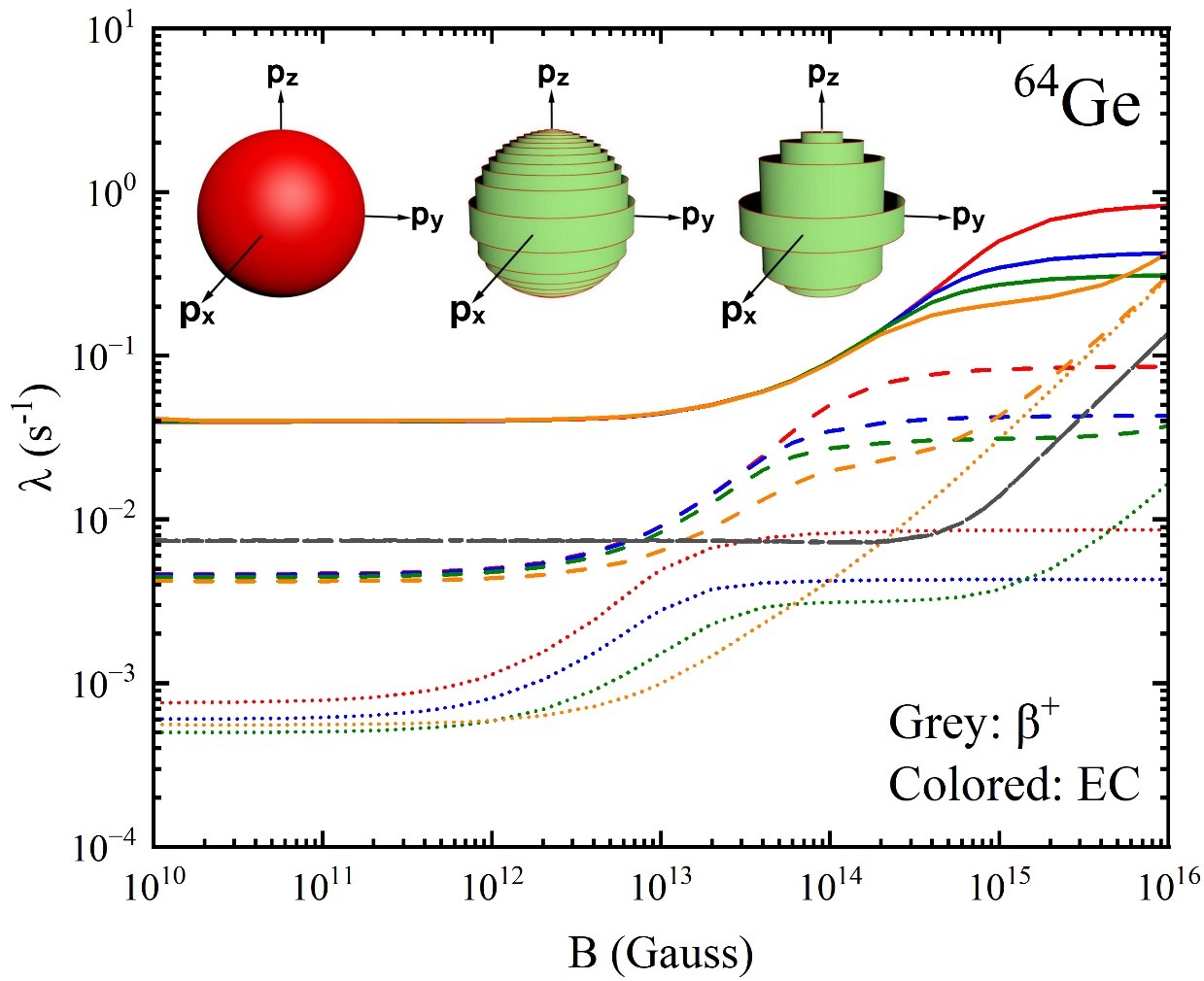 “从铁到铀的元素是如何产生的?”,即著名的“重元素起源”问题,被美国国家科学院于2003年列为了21世纪11个重大科学问题之一。快质子俘获(rp)过程为重要的天体核合成方式之一,其发生场所被认为是在绚丽的吸积中子星(图二左图)外层,合成路径表现为较轻的原子核连续俘获天体环境下的质子然后再进行衰变与电子俘获过程(图二右图)。其中,64Ge等几个等待点核,由于在地球环境下的衰变率很弱(半衰期很长),因此决定了rp过程的时标、路径、丰度及相应的中微子发射率。然而,在高温、高密、强磁场的天体环境下,一方面,原子核的电子俘获过程通道被打开;另一方面,天体环境下的衰变率和电子俘获率极有可能与地球环境下的截然不同。为此,王龙军教授课题组发展了可以同时包含容许跃迁与一级禁戒跃迁以成功计算高温、高密、强磁场的天体环境下原子核弱衰变率与中微子发射率的角动量投影理论与模型,研究结果如图三所示。当磁场较弱时,电子费米球内的朗道能级非常密,面密度与有效朗道能级数的平衡导致衰变率不随磁场的变化而改变。当磁场很强时,朗道能级数目极少,电子俘获率将快速随磁场的增强而增加。这将导致在强磁场环境下rp过程相关核素的总衰变率快速增加,从而影响rp过程的时标、路径、丰度及相应的中微子发射率与冷却过程等。