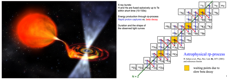 图二:rp过程的发生场所(左:吸积中子星)与合成路径(右)。