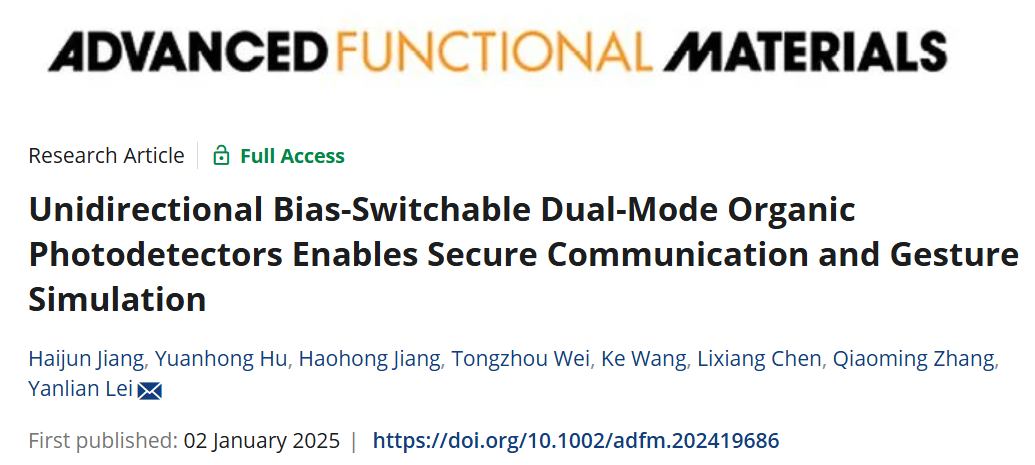 近日,我院新型显示与光电感知科研团队雷衍连课题组在多模有机光电探测领域取得最新进展,相关研究成果以题为“Unidirectional Bias-Switchable Dual-Mode Organic Photodetectors Enables Secure Communication and Gesture Simulation” 在国际知名期刊《Advanced Function Materials》(中科院一区TOP,IF:18.5)上在线发表。我院2022级硕士研究生蒋海军为该论文的第一作者,雷衍连副教授为通讯作者,365英国上市集团物理科学与技术学院(微纳结构光电子学重庆市重点实验室)为唯一署名单位。