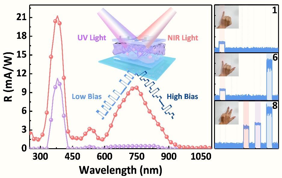 近年来,有机光电探测器(Organic Photodetector,OPD)在灵敏度、响应时间和光谱范围等方面的研究取得了显著进展,但如何实现单一器件对多个光谱带的响应仍是一个挑战。现有双模态OPD的设计通常涉及光敏层的垂直堆叠。这些设计虽然能够实现双模态功能,但需要改变外部电压极性或者光入射方向来切换光谱响应波段和模式,增加了操作复杂性。针对这一问题,本研究提出了一种单向偏置可切换双模OPD。通过优化聚(4-丁基-苯基-二苯胺)和非富勒烯受体Y6的混合比例和膜厚,调控光场分布和非平衡载流子传输动力学,实现了选择性光谱检测,即在低偏压下实现对紫外光(UV)的单波段检测和在高偏压下实现对紫外光和近红外光(NIR)的双波段检测。这种双模态OPD具有简单的单层结构,仅需单侧光入射,无需改变电压极性,从而简化了设备架构并降低了操作复杂性。研究结果表明,该装置能够有效处理和分离混合光信号,为数字通信系统的安全性和功能性提供了新的思路和解决方案。