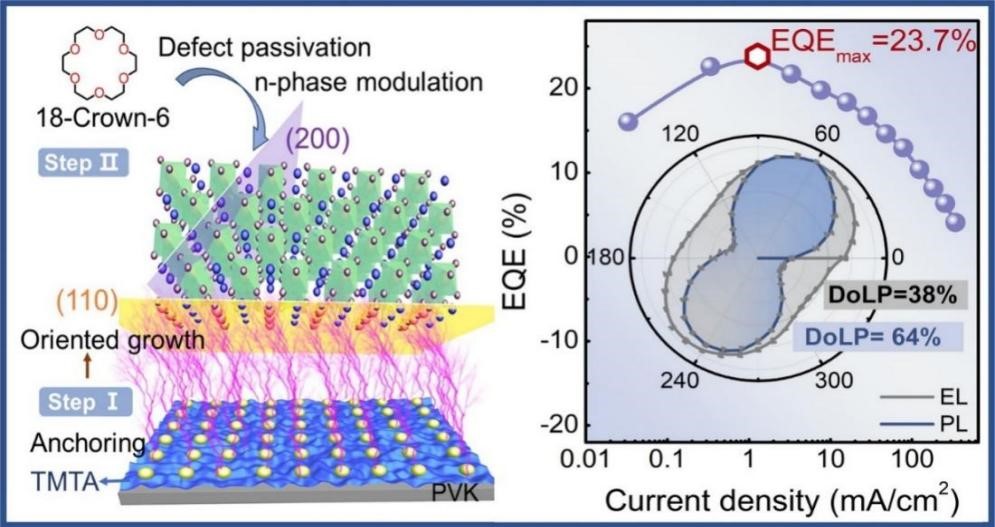 发光二极管(LED)中的线偏振光特性,在全息立体成像和保密光通信等方面具有重要的应用价值。先前的工作绝大多聚焦于“发光层以外微纳光学元件的集成”,并以牺牲部分器件效率为前提开发线偏振光LED,因此限制了LED的成像质量。为解决这一瓶颈问题,一种可行的策略就是“改造LED的发光层”。然而,传统薄膜LED在改造发光层时,不论在材料合成、薄膜分子调控,还是器件效率方面都面临着巨大的挑战。相比其它发光材料,准二维钙钛矿不仅具有解除简并的三重态能级以及优势取向的面内偶极矩,还可以通过溶液加工成膜且器件性能优异。因此,本工作选择“准二维钙钛矿发光薄膜”作为发光层,并探讨了“晶体缺陷钝化和锚定取向生长”在准二维钙钛矿薄膜中的实现策略,为“宏观跃迁偶极矩和晶体各向异性”提供独特的解决方案,最终实现了具有偏振光特性的高性能钙钛矿LED。