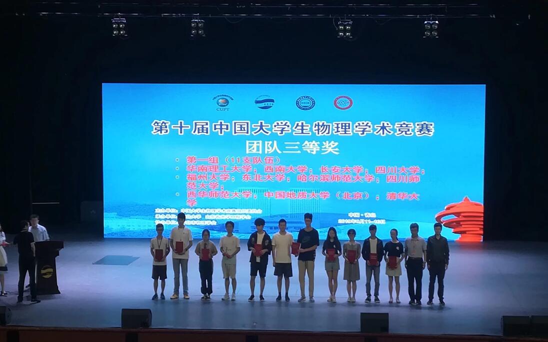 CUPT代表队的组建成功搭建了学院本科生科技创新平台,提高了学院学子积极参加物理创新竞赛的热情,促进了学院学术科技创新活动的蓬勃开展。截至目前,学院代表队成员已成功申请多项“国创” “市创”项目,并取得了第十届中国大学生物理学术竞赛全国三等奖,第十一届中国大学生物理学术竞赛全国三等奖,第四届西南地区大学生物理学术竞赛一等奖(两项),第三届西南地区大学生物理学术竞赛一等奖一个、二等奖一个的优异成绩。