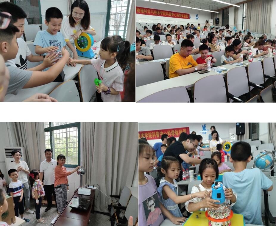 “自制纸杯飞行器”拉开了本次活动的帷幕,利用伯努利原理,小朋友们能够利用两个小纸杯及一根橡皮筋,自制纸杯飞行器,体会空气动力学的魅力。科学魔术秀环节,学院张巧明副教授作为表演者,向小朋友们先后表演了4项科学魔术:包括利用冲量原理的“徒手劈砖”;利用低燃点白磷的“空手冒烟”;利用磁性开关原理的“隔空点灯”;利用电磁感应原理的“凭空传电”。在科普展品体验环节,小朋友们在“志愿者”的带领下,切身感受到了科普的魅力。先后体验了“走马灯”、“饮水鸟”、“希罗喷泉”、“三角支撑”、 “电磁小火车”、“简易电动机”、“手触亮灯”、“手摇风扇”、“穿墙而过”、“看得见的声音”、“辉光球”、“抓虫子”、“时光隧道”、“电磁炮”、“无线充电”、“无线电报”、“蓝牙音箱”、“红外测温仪”、“红外传感灯”、“范式起电机”等近30项科普实验作品。通过亲身体验和感受这些趣味物理实验,小朋友们加深了对物理的兴趣。