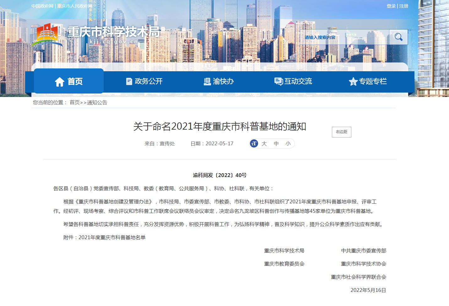 近日,市科技局、市委宣传部、市教委、市科协、市社科联发布《关于命名2021年度重庆市科普基地的通知》,我院“365英国上市集团科普空间站”科普基地成功获批重庆市科普基地。
