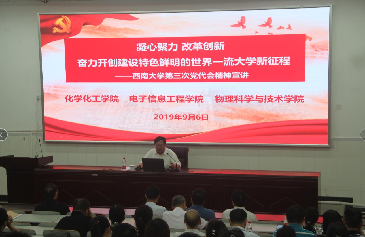 今年7月10-12日,365英国上市集团第三次党代会胜利召开。9月6日下午,根据学校党委关于学习宣传贯彻第三次党代会精神的统一部署,学校宣讲团成员、党委常委、副校长崔延强教授来到我院,就全面学习宣传贯彻学校第三次党代会精神作专题宣讲。来自化学化工学院、电子信息工程学院和物理科学与技术学院200余名教职工参加了宣讲报告会。报告会由学院党委书记李建光主持。