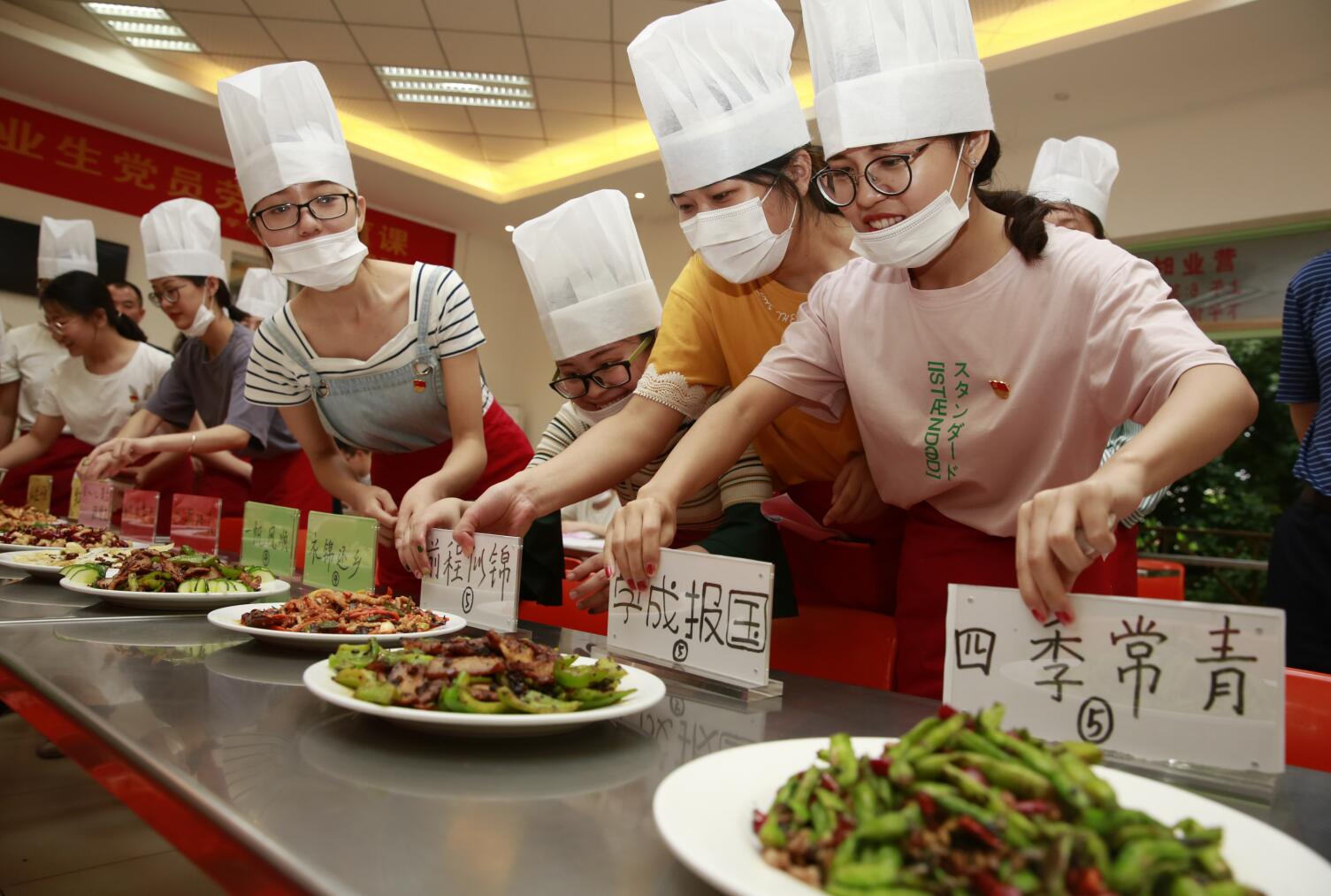 有了大厨带,毕业生们兴致特别高。刚看完师傅演示,就迫不及待开始了自己的表演。青春洋溢的大学生,戴着洁白的厨师帽和口罩,穿上酱红色的围裙,奔忙在亮锃锃的食堂后厨,叮叮当当奏起了锅碗瓢盆交响曲。