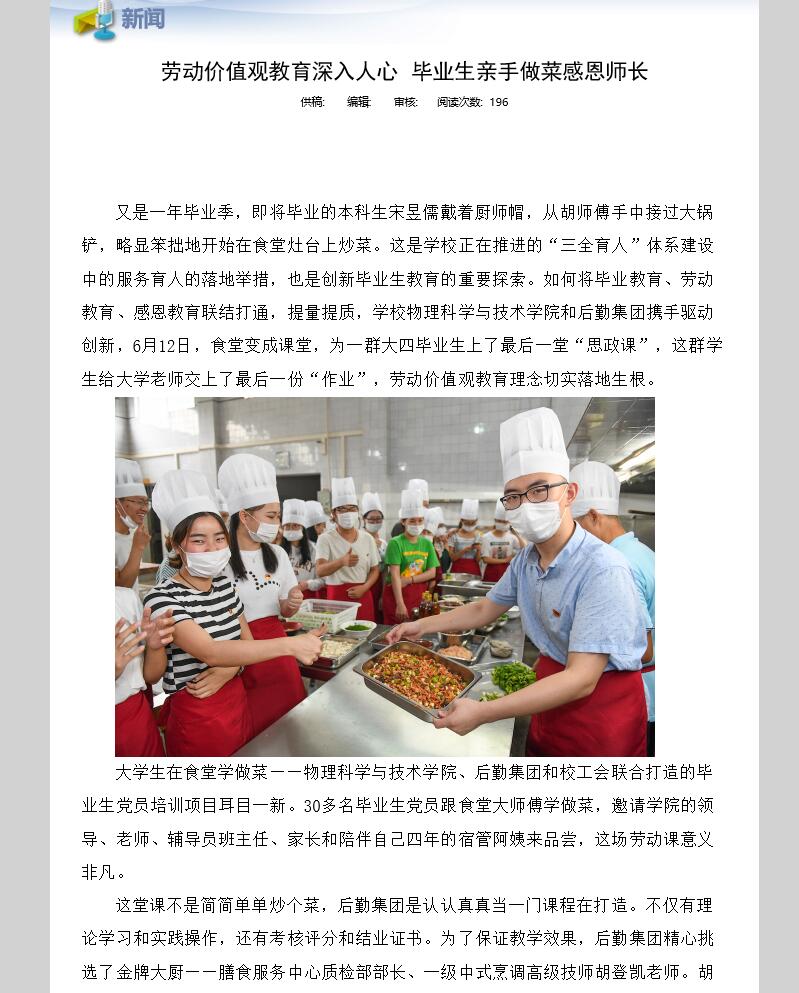 为创新学院毕业生党员教育,推进“三全育人”体系建设中的服务育人举措在学院落地,6月12日,学院党委专门联合学校后勤集团、校工会,让30多名本科毕业生党员跟食堂大师傅学做菜,亲手做出一桌原汁原味的“谢师宴”,邀请学院领导老师、辅导员班主任、家长和陪伴自己四年的宿管阿姨来品尝,作为毕业生的最后一堂劳动课。