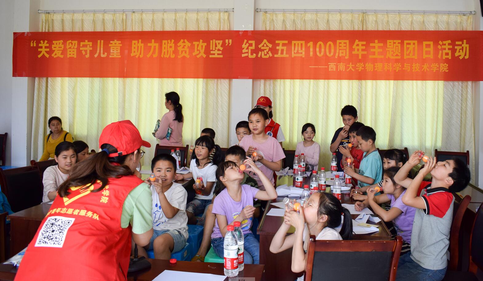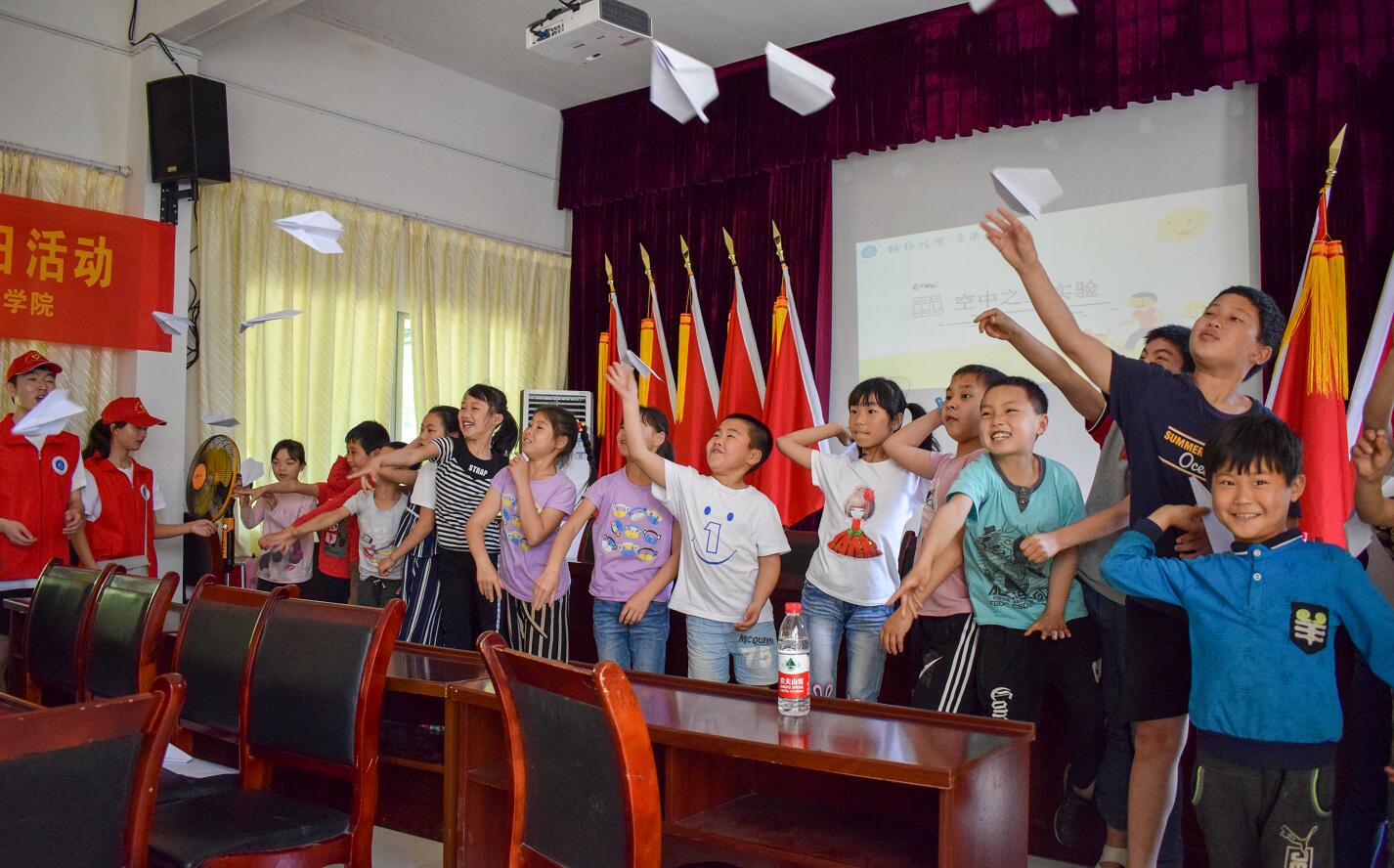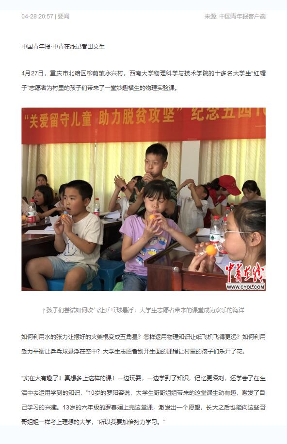 4月27日,学院团委学生会牵头,集合本科生党员先锋队和科普空间站学生骨干组成一支十二人的“红帽子”青年志愿者服务队走进市级贫困村北碚区柳荫镇永兴村,开展“关爱留守儿童 助力脱贫攻坚”纪念五四一百周年主题团日活动,为村里的孩子们带去妙趣横生的物理实验课,以青春力量参与地方扶贫工作,得到《中国青年报》关注报道。