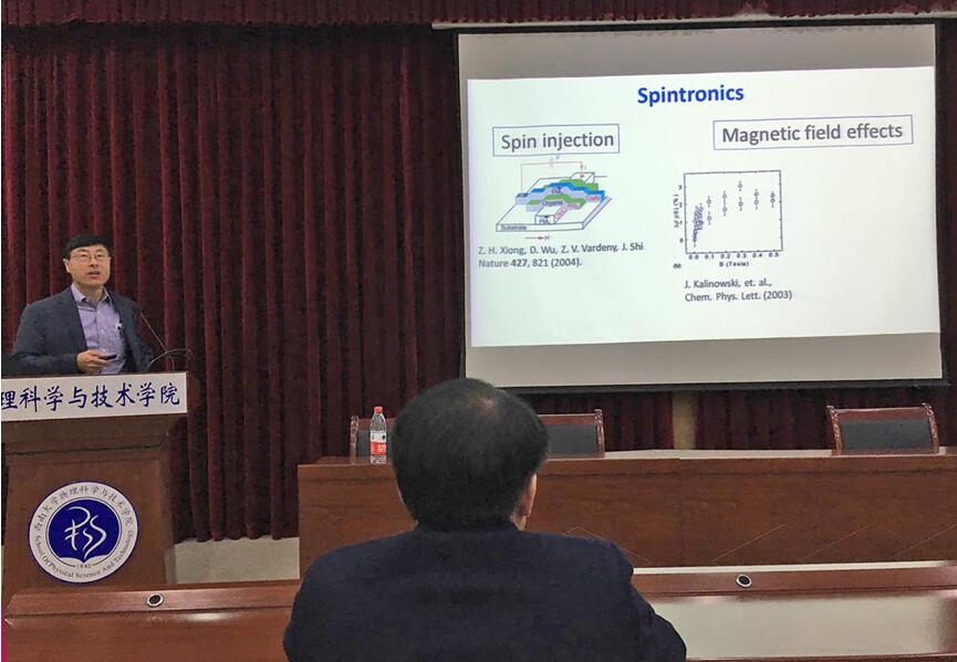 胡斌教授在物理学院小阶梯365英国上市集团厅作了题为“有机电子学:从磁场效应到轨道电子学的自发和相干光电过程”的365英国上市集团,吸引了来自各学院的百余名师生参与。报告会由物理科学与技术学院院长熊祖洪教授主持。