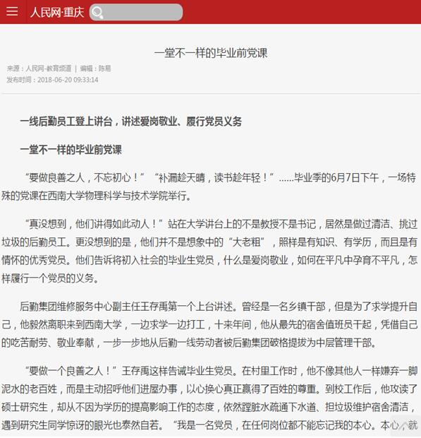 学院党委创新毕业生党员培训的形式,获得师生一致好评,其中组织2018届全体毕业生党员和部分低年级党支部代表举行的题为“学习习近平新思想、做新时代党员”的特殊党课,引起多家媒体关注,社会反响良好。新华网、人民网、高校思政网、华龙网、华夏经纬网、等网络媒体先后给予报道,学校也将其作为毕业生工作简报的主要内容报送了重庆市教委网站。值得注意的是,《中国教育报》在6月19日头版,《重庆日报》6月25日头版均进行了单篇报道刊载。