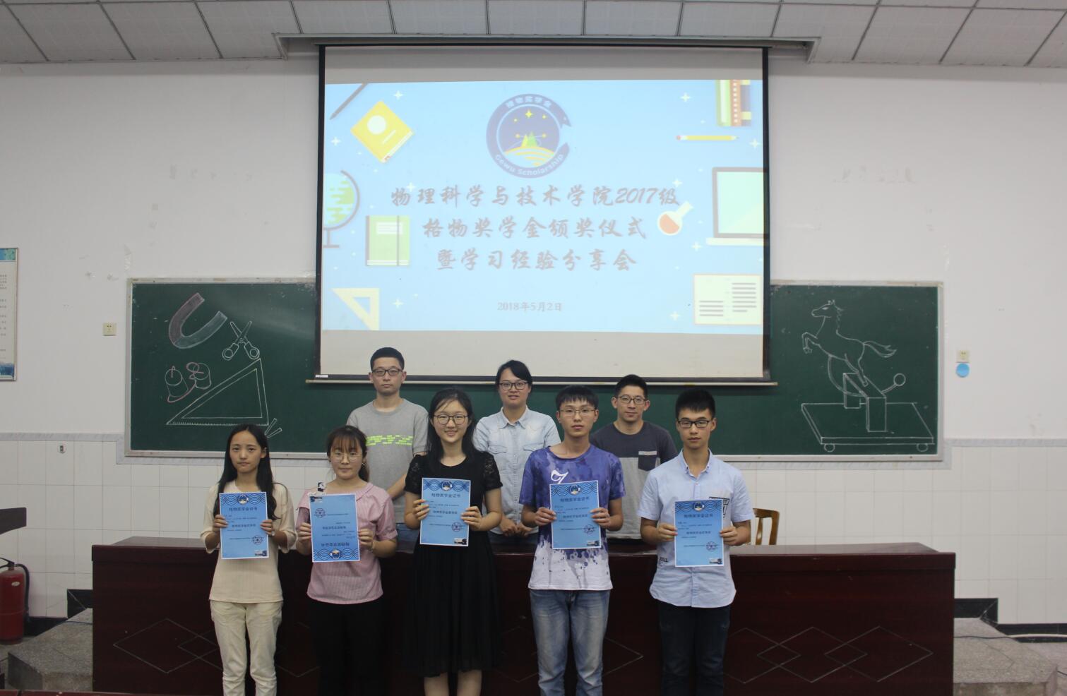 5月2日下午,学院在大阶梯教室举办2017级“格物奖学金”颁奖仪式暨学习经验分享会。2017级辅导员贺颖、师范四班班主任匡泯泉、物理学班班主任王啸天老师和2017级全体本科生参加了活动。