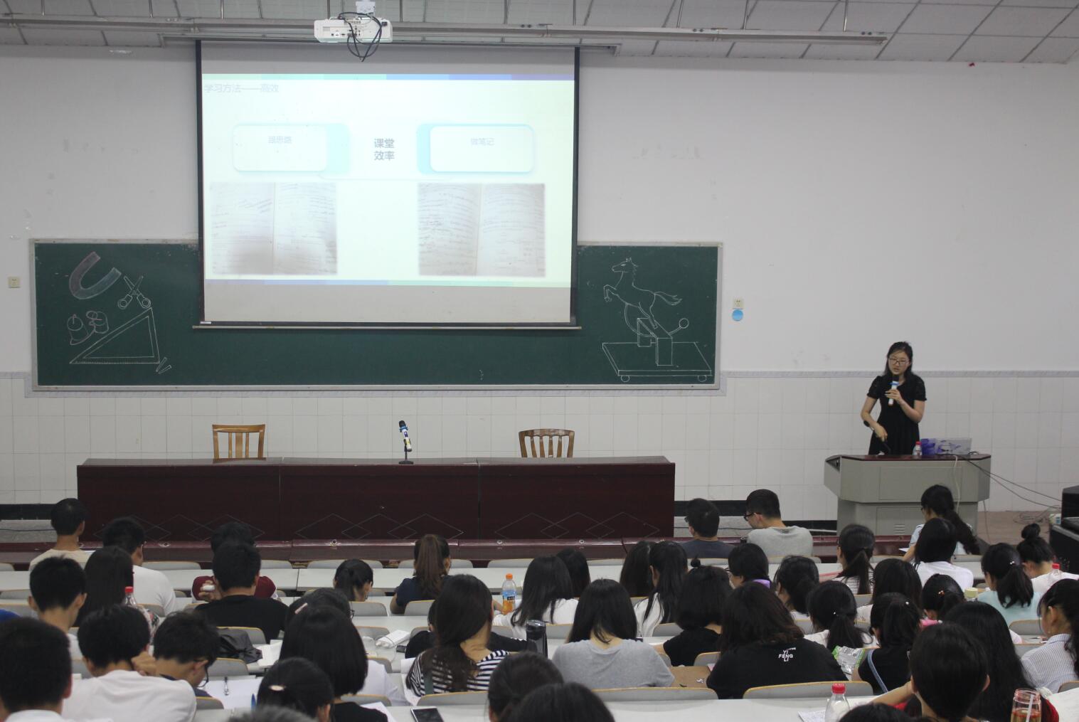 随后,来自物理师范2班、上学期综合成绩排名全年级第一的刘潇涵同学从学习方法、时间管理以及课余生活三个方面与大家展开了交流。她用郭靖向洪七公学习降龙十八掌的过程比喻分析大学学习,认为“要想学得真功夫,高效、勤奋、认真才是秘籍!” 她还通过PPT展示了自己每个月、每个周乃至每一天、每个小时的时间规划,总结出“增强自制力、提高效率至关重要”。最后,她分享了自己的两个业余爱好——“阅读和运动,不要满足于碎片化的电子阅读,应当多读经典著作,才能提升自我修养与素质”。