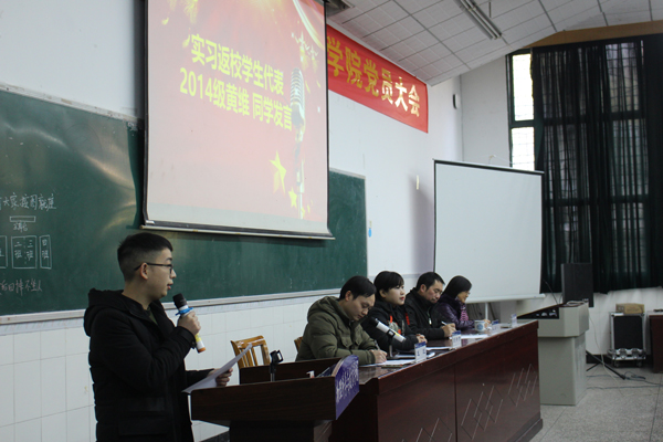 随后,2014级实习返校学生代表黄维同学分享了实习经验。他从适应、认真、耐心三个方面多个维度分享了自己的实习历程,表达了对学弟学妹们的衷心祝福。2015级李硕同学代表实习学生发言,他代表全体实习生感谢了学院老师对同学们的辛勤培养,并郑重承诺在实习中摆正心态,勤奋好学,乐于吃苦,以积极心态、饱满的热情、良好的精神风貌对待实习。