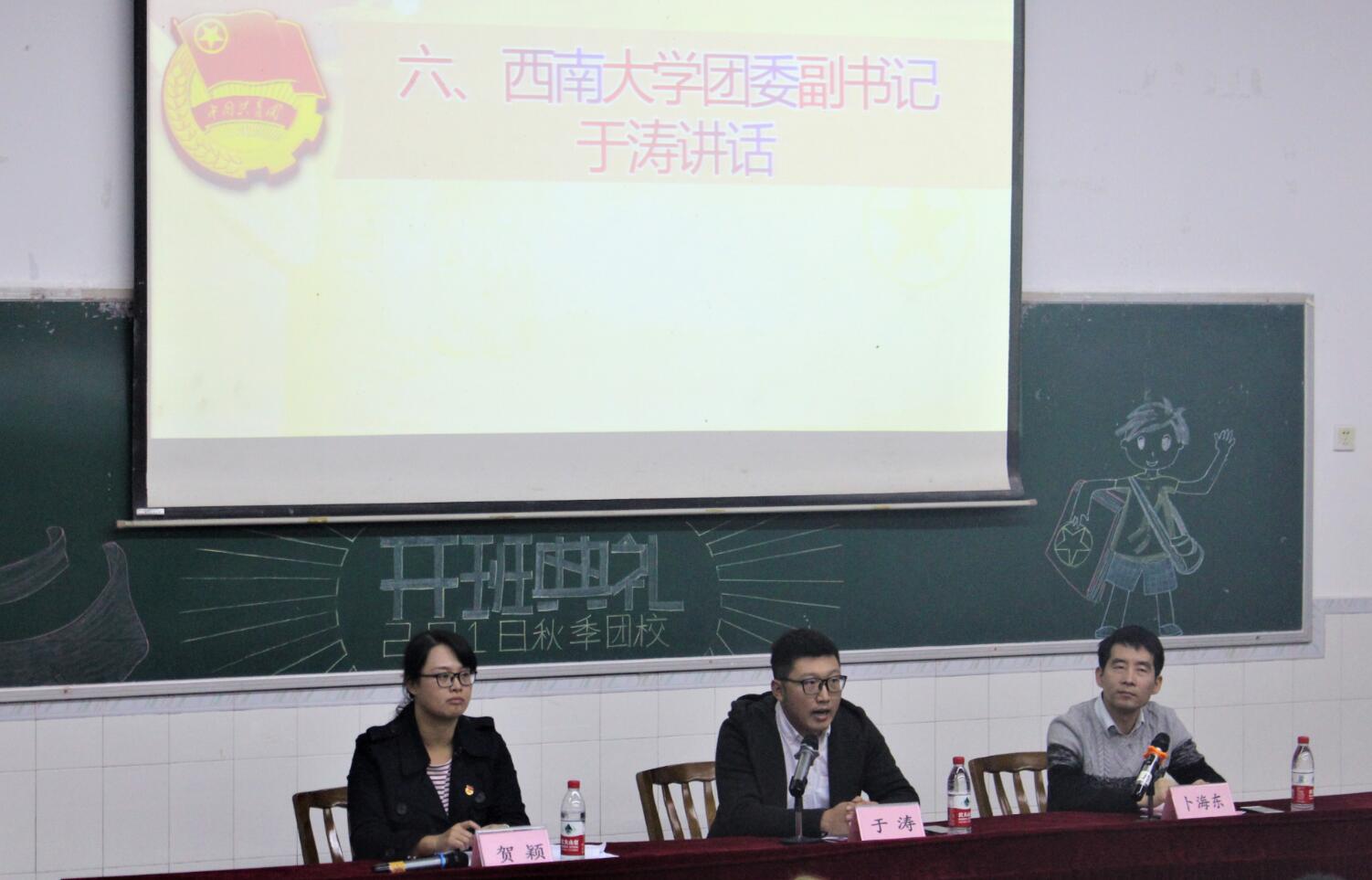 最后,校团委副书记于涛老师致辞,代表校团委对学院团校开班表示祝贺,肯定了学院团学工作的优良传统和特色品牌,强调团校在联系青年、教育青年、服务青年中发挥的重要作用。他寄语全体学员,在学生工作中“回归初心、坚守红心、满怀热心、奉献爱心”。