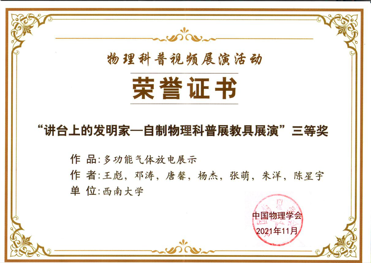物理科学与技术学院三个作品经过各位老师和同学的精雕细琢,反复打磨,在大会中表现优异。由张巧明、杨继勇老师指导的《被中香炉-文物中的物理》获得“科学三分钟——物理科普讲解视频展演活动”二等奖,《天空为什么是蓝的》获得“科学三分钟——物理科普讲解视频展演活动”优秀奖,由王彪、邓涛老师指导的《多功能气体放电演示》获得“讲台上的发明家——自制物理科普展教具展演活动”三等奖。