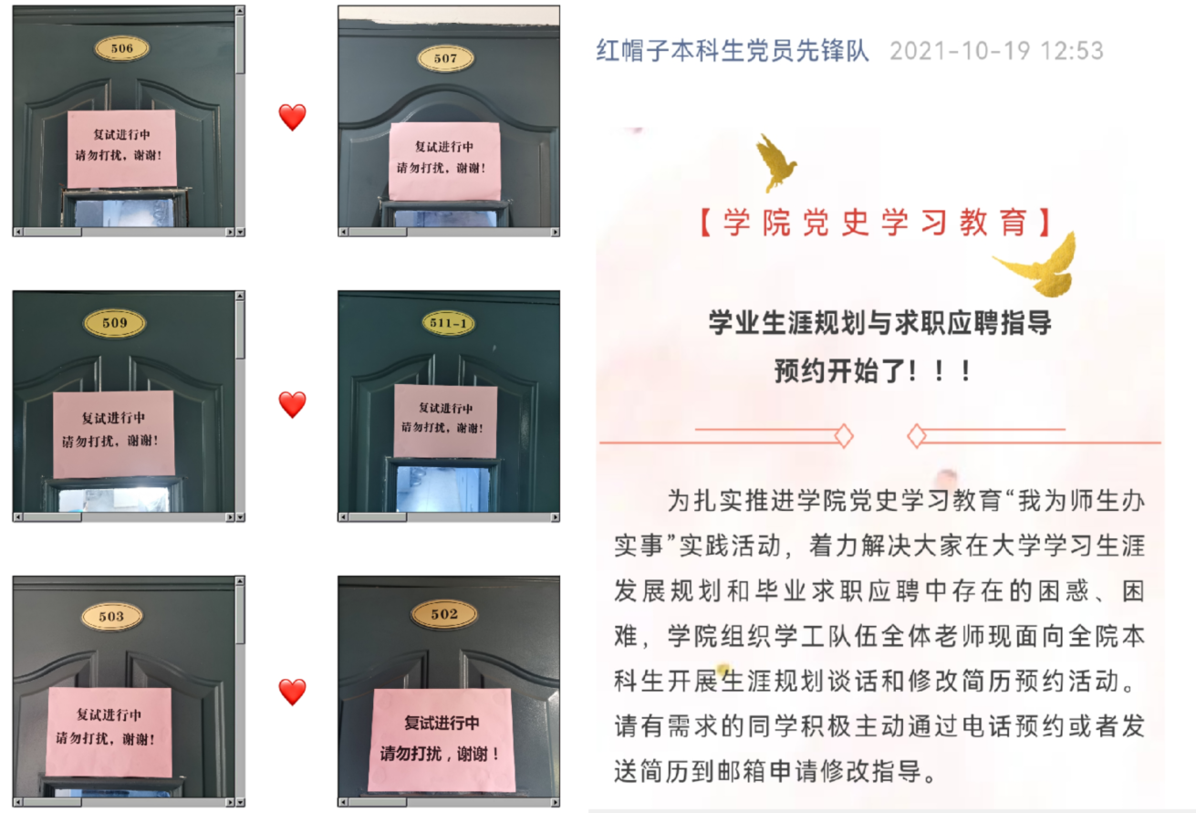 提早部署,全力营造就业氛围。通过及时召开毕业生就业动员会、考研就业指导暨实习工作动员会等,在全体毕业生中营造就业氛围。建立学院党政联席会成员一对一联系本科生班级、副书记担任毕业班级班主任的工作机制,多渠道推动“靠前指挥”落地落实。打造“教授下午茶”等活动品牌,多角度吸引研究生导师、专业教师更广泛参与学生职业规划和就业指导工作,形成全院参与就业工作局面。