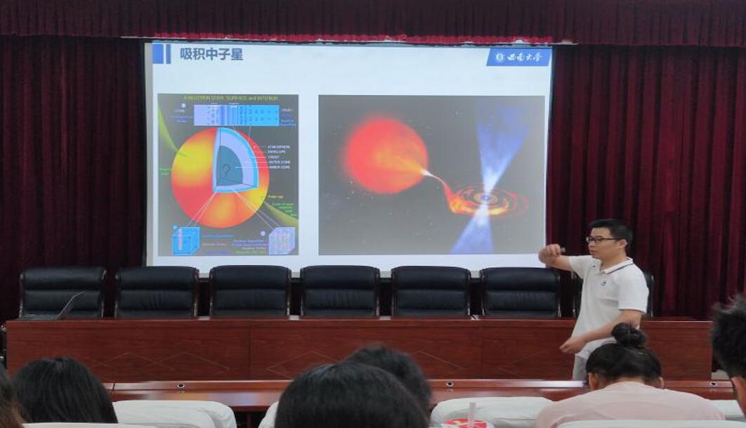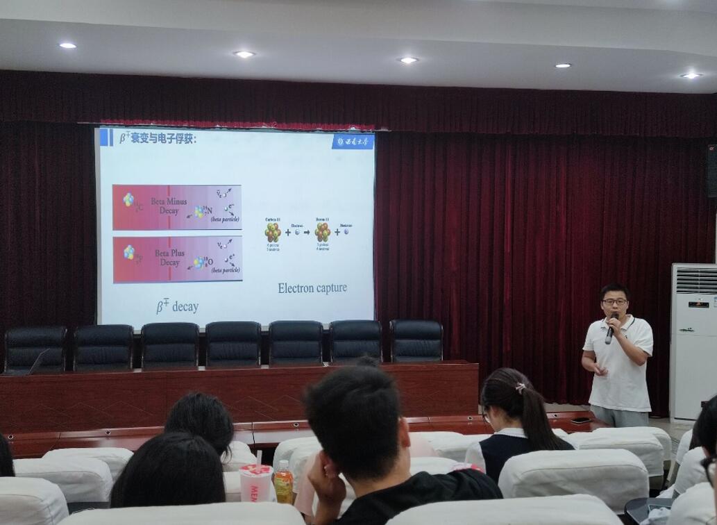 王老师首先给同学们讲解了核物理的一些基础知识,包括什么是核素图,核衰变的三种类型——α衰变、β衰变和γ衰变,衰变率和半衰期的定义和物理意义。接着,王老师对恒星的演化、元素起源、中子星吸积现象等同学们感兴趣的核天体相关内容进行了讲解。此外,借助简单的结合能公式,王老师还对原子核的结合能和比结合能进行了形象讲解,并以核反应堆为例,对核聚变与核裂变中原子核及其能量的变化规律做出分析。