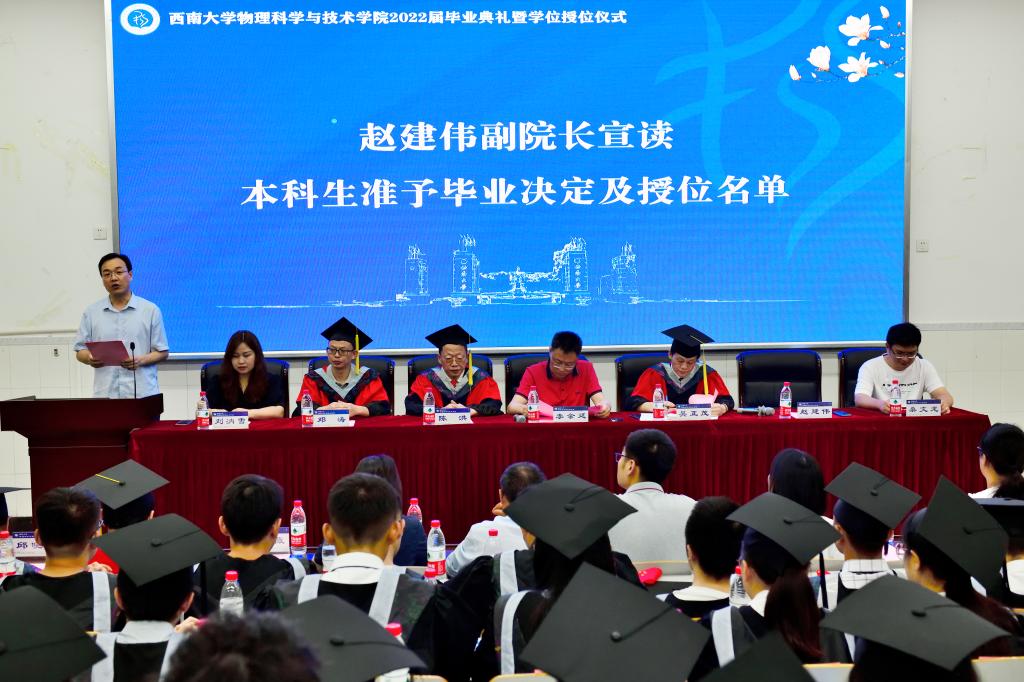 毕业典礼在庄严雄壮的《国歌》声中拉开序幕。赵建伟副院长宣读2022届本科生准予毕业决定及授位名单,学院228名本科生顺利毕业并获得学位。随后,吴院长和院学术委员会委员为每位参会2022届毕业生颁证、授位。导师们一一拨正学位帽上的流苏,与毕业生握手合影,仪式现场庄严有序。