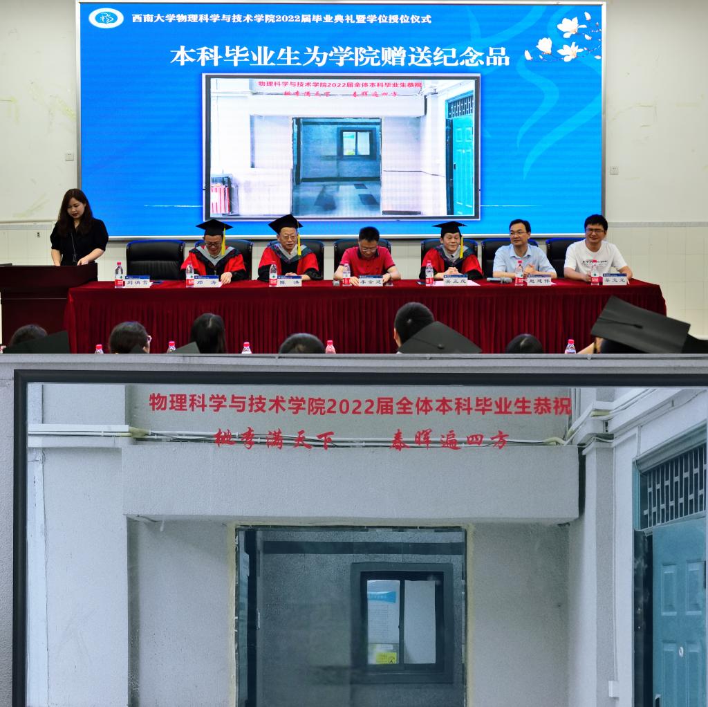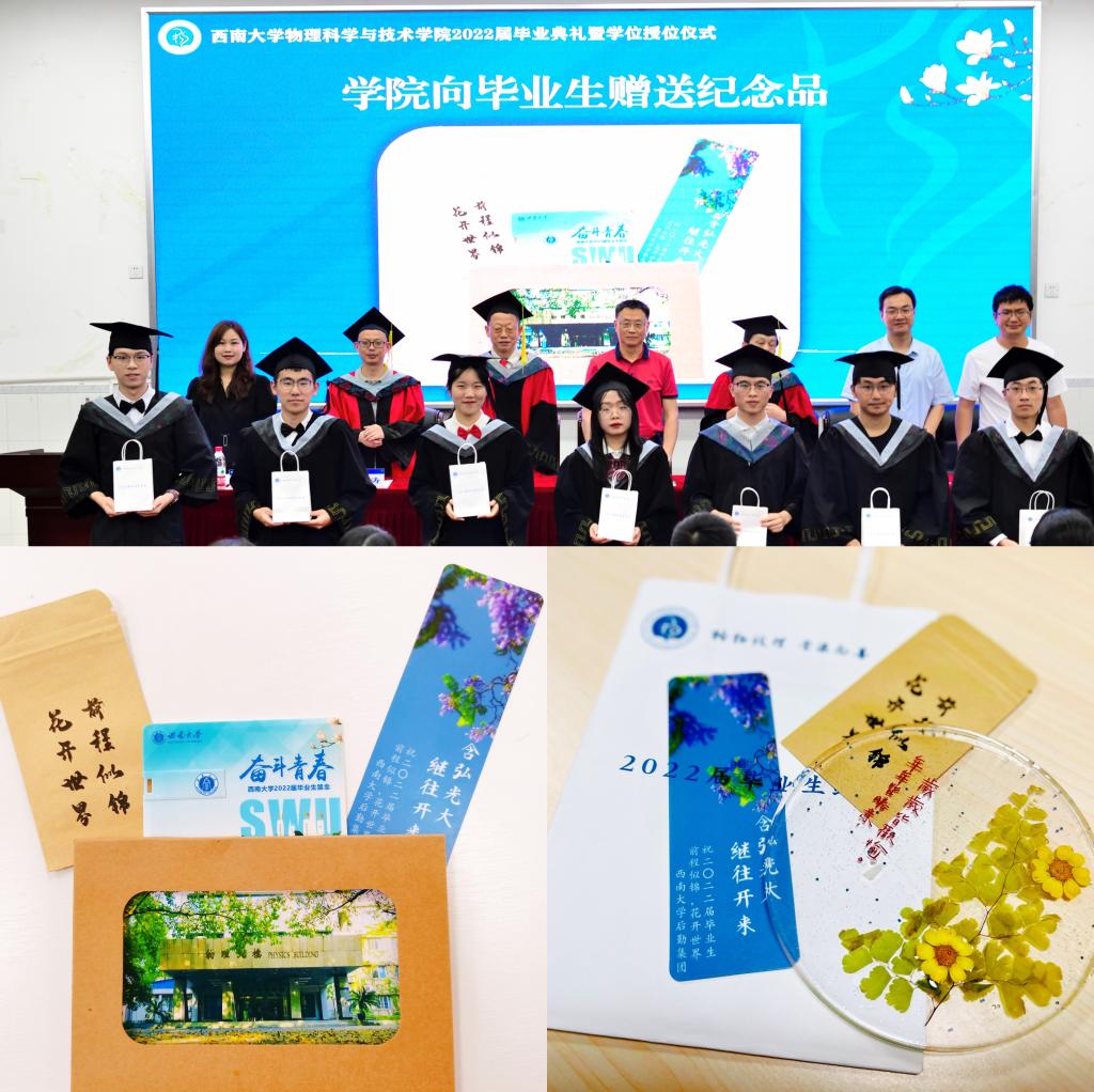 随后,主席台就坐的领导老师与毕业生互赠毕业纪念礼物,学院精心准备了格桑花种、书记院长签名的额学院风景明信片。“格桑”是“美好时光”或“幸福”的意思。今夏校园处处格桑花开,与蓝花楹交相辉映,这其中还有毕业生党员同志亲手种下的成果。学院与后勤集团携手将格桑花种赠予毕业生们,之前后勤集团党委还向全体毕业生党员赠送了用格桑花制作的杯垫。2022届本科毕业生从师生需求考虑准备了仪容镜相赠,“正衣冠、端品行”,立志秉承学院正直、严谨的优良作风,行稳致远。