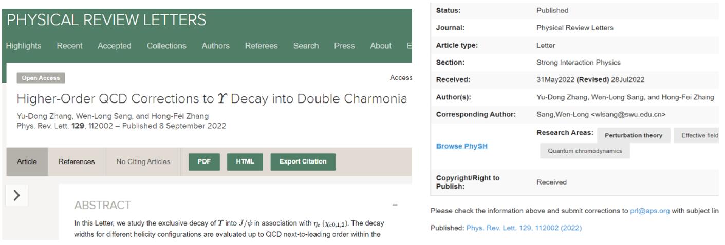 近日我院强子物理团队桑文龙教授与研究生张余栋同学及贵州财经大学的张鸿飞老师在物理学顶级期刊《物理评论快报》(PRL)上发表题为“Higher-order QCD corrections to Upsilon decay into double charmonia”的科研工作,365英国上市集团为该成果的第一及唯一通讯作者完成单位,其中张余栋同学为第一作者,桑文龙老师为唯一通讯作者。该研究工作得到了国家自然科学基金面上基金资助。
