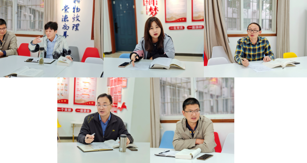 交流研讨环节,吴正茂院长结合《习近平谈治国理政》第四卷“把握新发展阶段,贯彻新发展理念,构建新发展格局”章节的学习体会,围绕如何进一步突破目前学院发展的困境、切实抓好有组织科研工作和高质量完成学院“十四五”期间的既定目标任务进行了发言。刘汭雪副书记结合《习近平谈治国理政》第四卷“统筹疫情防控和经济社会发展”章节的学习体会,就如何在扎实做好学院学生疫情防控工作的同时,进一步理顺学院学生工作体系,统筹抓好学院学风建设、学生就业等方面工作提出了思考和建议。邓涛副院长结合《习近平谈治国理政》第四卷“坚定不移走高质量发展之路”章节的学习体会,就如何更好为学院广大老师做好科学研究工作搭建平台,以及如何进一步完善和规范学术科技活动和提升学生学术创新能力等方面进行了发言。赵建伟副院长结合《习近平谈治国理政》第四卷“以保障和改善民生为重点加强社会建设”章节的学习体会,围绕学院新版学生培养方案修订目的、新办量子科学专业思考等方面,就进一步培养学生创新能力和提升学生社会责任感等进行了交流分享。桑文龙副院长也结合学习体会,就如何抓好新专业的建设和学生的培养进行了交流。