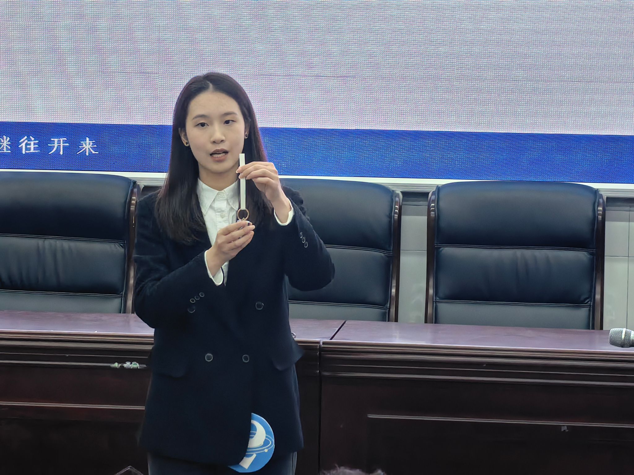 接下来上场的是讲课组。首先由2021级周可一讲授课题《光的偏振》。她以一个穿墙而过的小魔术为开头,引出光的透射强度与偏振现象的关系,整体教学节奏紧凑,语言表达流畅。