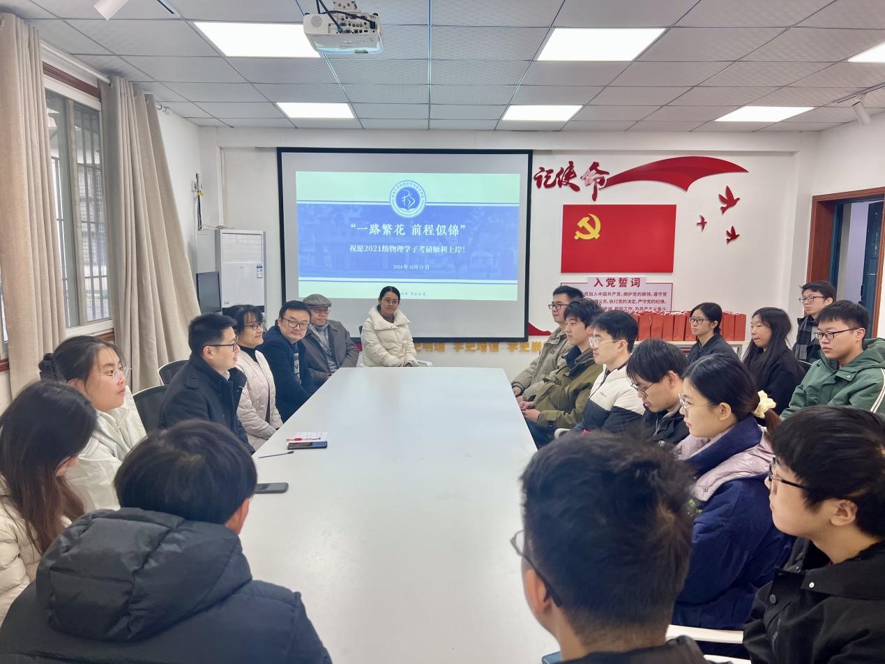 在2025考研冲刺的号角已然响起之际,12月11日上午,来自2021级物理学班的22名考研学生代表受邀来到学院党建活动室活动室参加 “一路繁花,前程似锦”2025届考研学子慰问活动。学院党委书记舒刚、副书记娄霞、副院长游霄鹏,2021级班主任李佳杰、赵晶晶和辅导员黄文静等老师来到现场,为考研学子加油打气,提振信心。