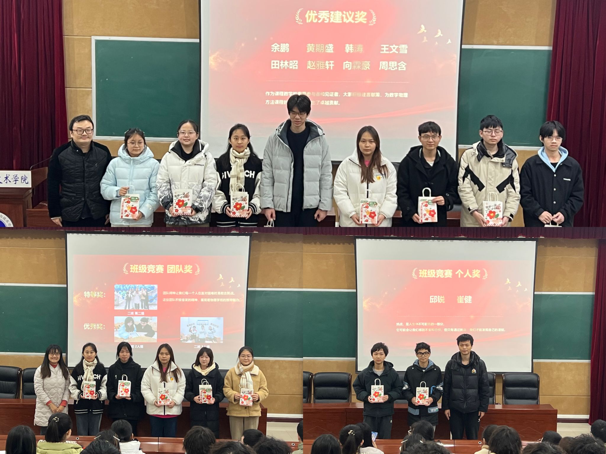 结课仪式上,学院党委副书记娄霞、副院长游霄鹏、2023 级辅导员贺颖老师和班主任朱华星老师共同见证了同学们的荣光时刻。本次仪式共设置了九个奖项,包括 “学习能手”“最佳风采”“勤奋好学生”“进步之星” 等,表彰在学习和课程活动中表现突出的同学。36 位获奖者依次上台领取秦老师亲手准备的五彩斑斓的糖果和点心。