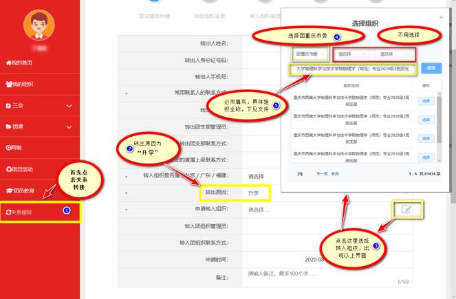 (4)“申请转入组织”先点击右边的小画笔,待出现选择组织界面后先选择“团重庆市委”,然后再输入组织全称进行搜索。