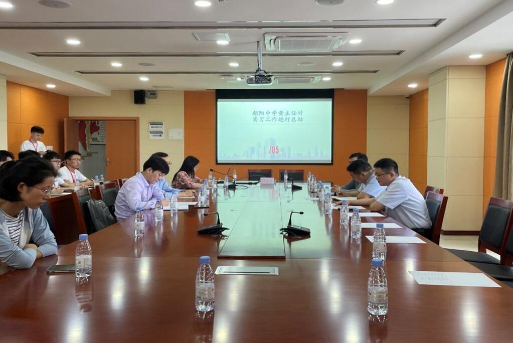 会议由陈晓莉老师主持。赵建伟副院长从学院实习总体情况、实习的性质、开展实习工作走访的目的与意义等方面进行了介绍。队长胡桂蜻同学从学科教学与班主任工作开展情况、存在的问题、未来规划等方面进行了中期汇报。黄坤林主任介绍了朝阳中学在实习安排与管理、实习生实习情况、存在的问题以及下一阶段工作开展等方面进行了介绍。周祖强副主任作为指导教师代表介绍了实习生在实习工作中的表现,在充分肯定成绩的基础上,指出实习生还存在气场不足、教学设计不规范等方面的一些问题,鼓励广大实习生再接再厉,圆满完成实习任务。王光毅副校长介绍了朝阳中学的发展情况、办学理念和管理特色,表示与学院长期有着多方面良好的合作共建关系,欢迎优秀毕业生应聘加盟,并鼓励正在开展实习的同学们要不怕苦,敢于挑战,多做一点,实习过程就会有更多收获。