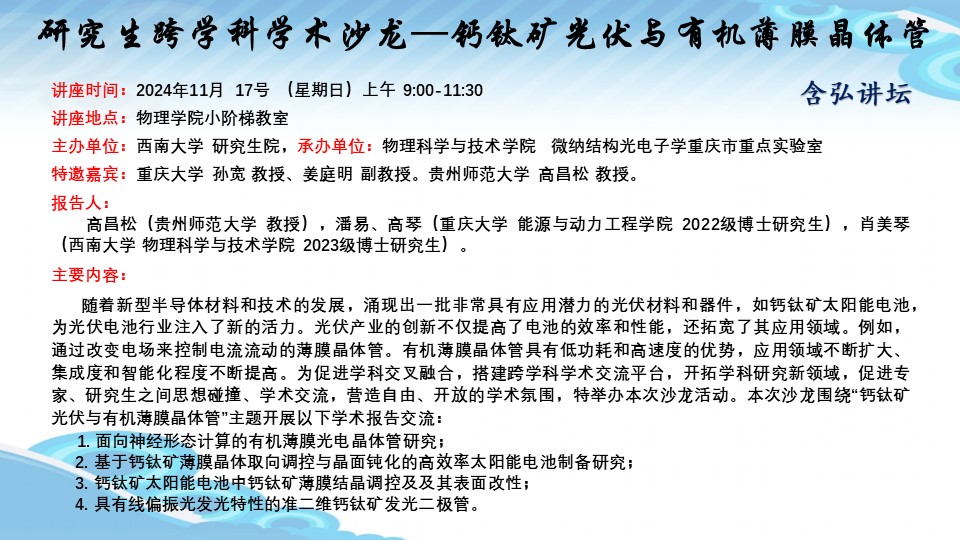 【研究生跨学科学术沙龙】钙钛矿光伏与有机薄膜晶体管