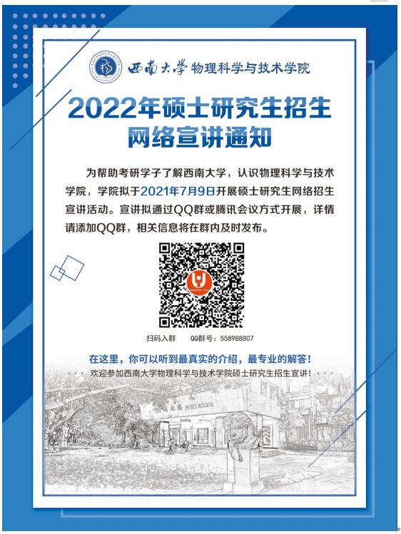 为帮助考研学子了解365英国上市集团,认识物理科学与技术学院,学院拟于2021年7月9日开展硕士研究生网络招生宣讲活动。宣讲拟通过QQ群或腾讯会议方式开展,详情请添加QQ群,相关信息将在群内及时发布。