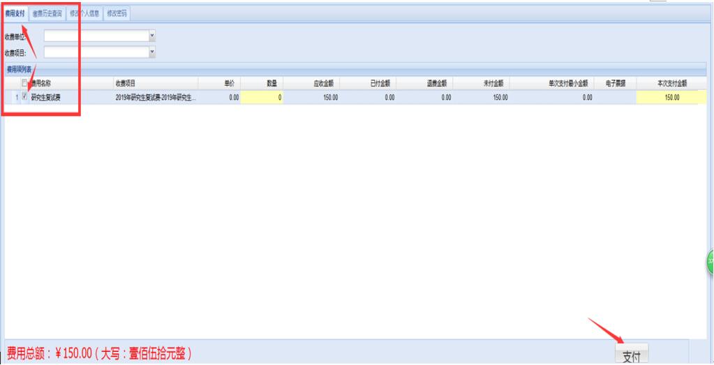 第2步:点击左上方“费用支付”界面,在费用项列表内选中(打勾)“研究生复试费”,点击右下方“支付按钮”。