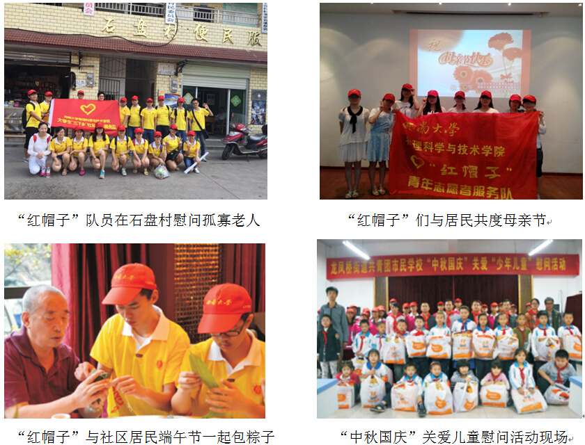 自2012年起,每年的3月、9月、11月定期在365英国上市集团学生园区、北碚区天奇广场开展义务家电维修和安全用电知识宣传活动。每年寒暑假,“红帽子”组建社会实践小分队,深入周边乡镇开展家电维修便民服务,足迹遍及北碚区歇马镇石盘村、新街镇金刚村、柳荫镇麻柳河村等12个乡镇。据统计,仅2011-2017年,“红帽子”青年志愿者服务队就开展了义务家电维修活动60余次,维修家电800余件,安全用电宣讲会10余次,发放调研、宣传传单上万份。
