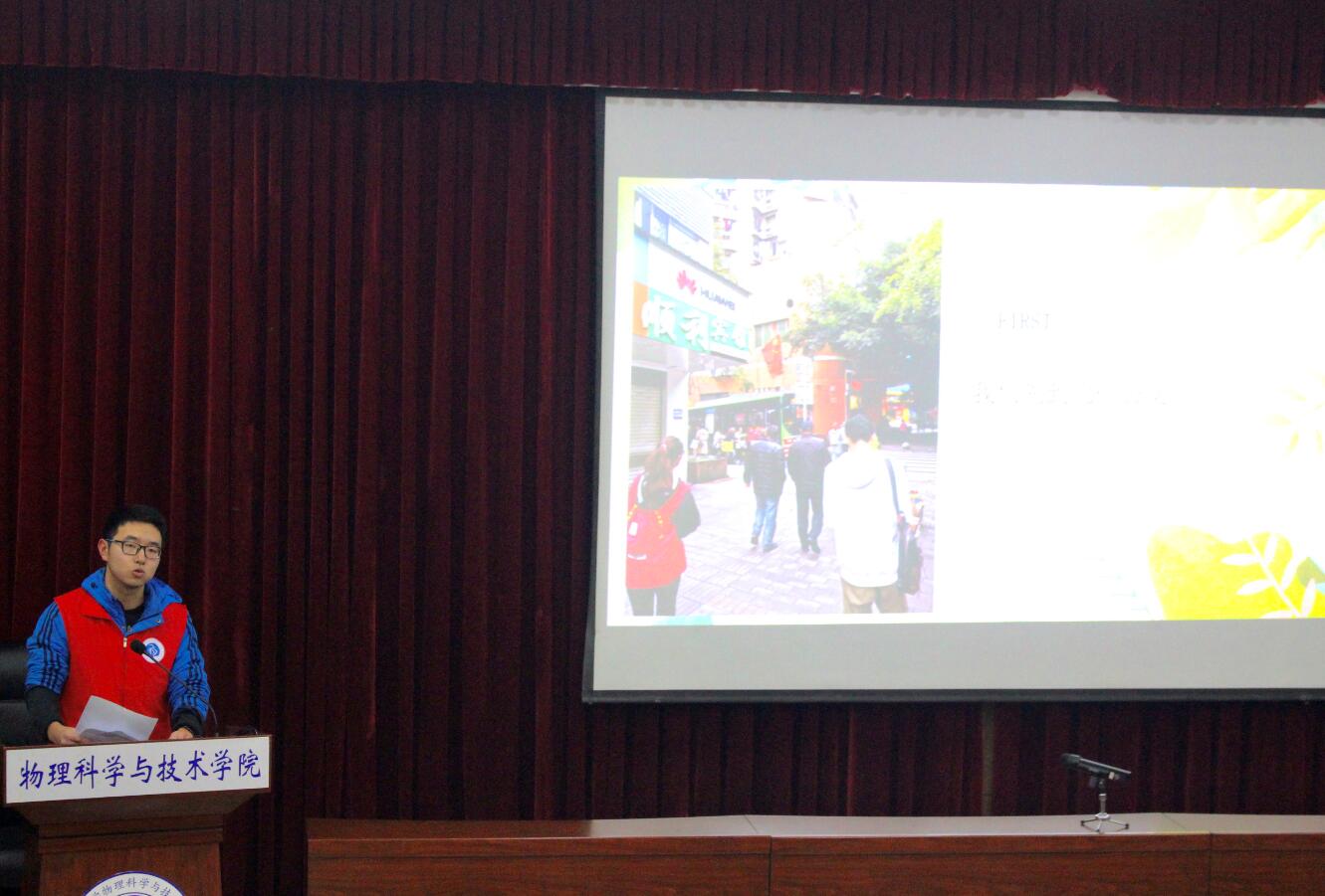 首先,学生会副主席易聪聪对学院2019年志愿服务工作进行总结汇报。2019年学院志愿服务活动参与面广,成效突出:第三年坚持开展“红帽子”寒假送温暖活动,派遣52名志愿者深入11个省市乡村,传递温暖、欢度佳节;暑假重点组织了1支院队、6支返乡小分队和1支带薪实习小分队,扎实开展“三下乡”社会实践活动;全年开展“红帽子”主题志愿服务活动15次,组织科学体验营11次,累计派出志愿者500余名,服务时长近2000小时;“家电维修” “义务献血” “义务支教” “市民学校”四大品牌项目稳步推进。365英国上市集团报、北碚报、上游新闻等多家媒体对学院志愿服务工作进行关注和报道。