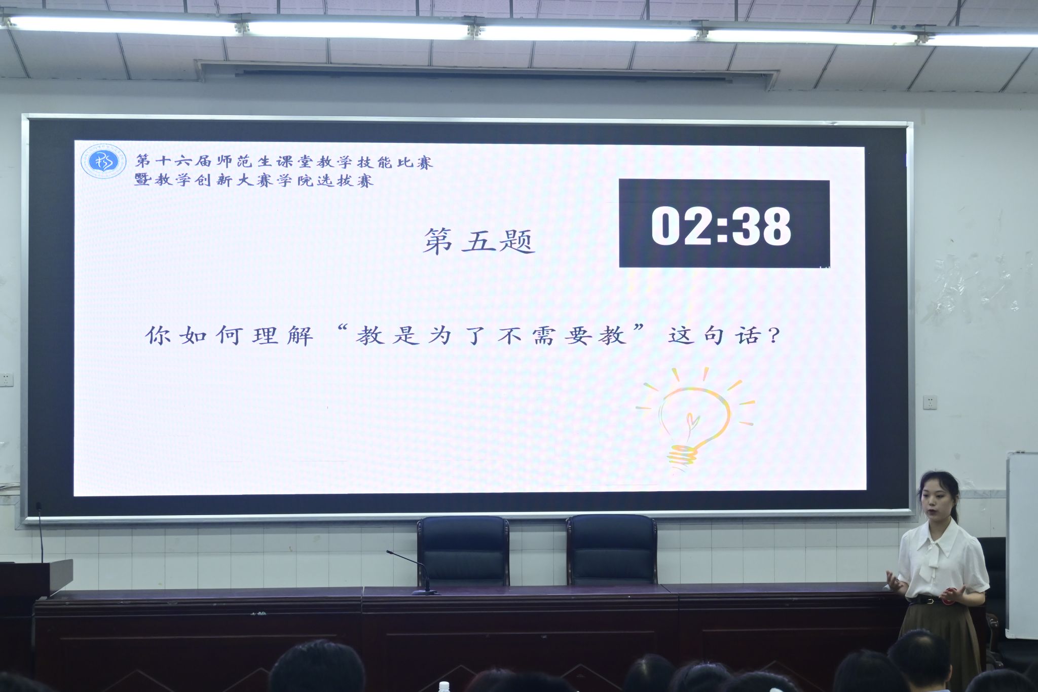 决赛分为模拟授课和即兴演讲两个环节。在十分钟的模拟授课环节,选手们精心备课,发挥出了自己的最好水平。