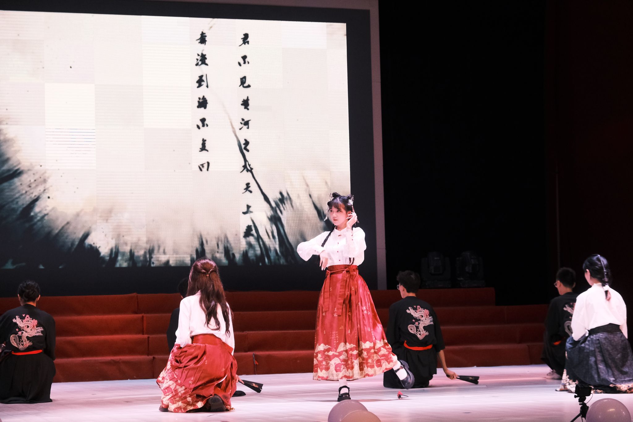 本场晚会由“青春·热烈的诗行”“青春·奋楫的手函”“青春·未来的序章”三个篇章组成,学院师生联袂带来16个精彩纷呈的节目。晚上7点,团委学生会办公室带来的国风舞蹈《将进酒》拉开了演出的序幕。