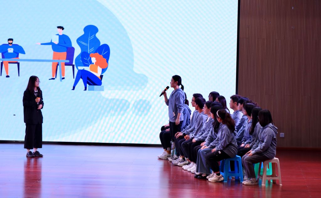 在决赛现场,一支部以极具创新性的演示文稿吸引了台下观众的兴趣,用微视频全面呈现了团日活动的具体流程和开展情况,通过幽默风趣的人物介绍视频和生动形象的现场表演还原了团日活动中的“模拟招聘”环节。最终,在悠扬的音乐中,全体成员起立,齐宣誓言,为本次展示画上圆满的句号。